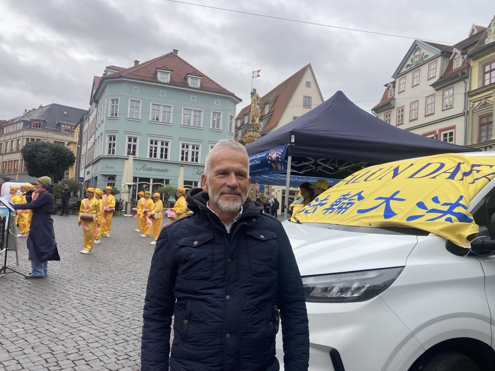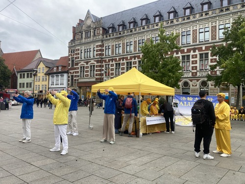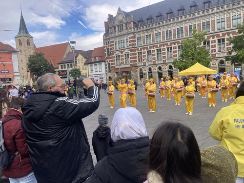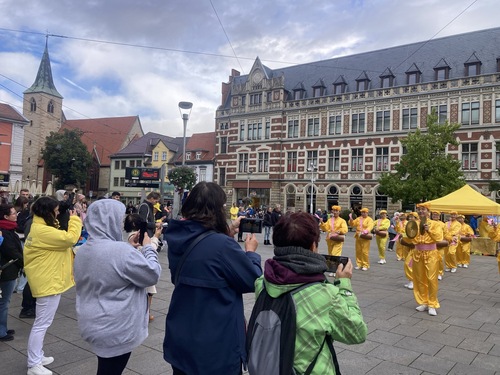 Эрфурт – административный центр федеральной земли Тюрингия. Практикующие Фалунь Дафа установили информационные палатки на Рыбном рынке и площади Ангерплац, где рассказывали людям о практике, продемонстрировали упражнения и представили зрителям танец с поясными барабанами.