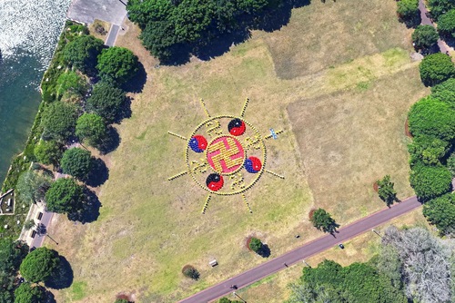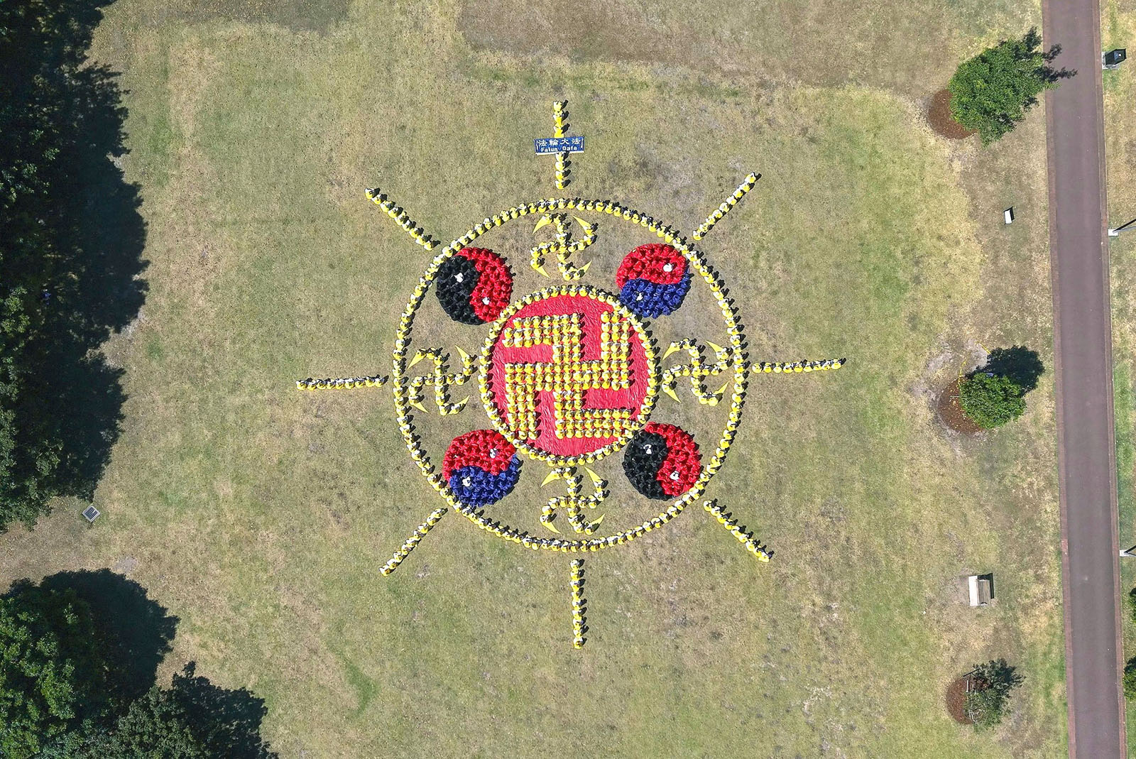 Практикующие сформировали эмблему Фалунь диаметром 24 метра. С учётом внешних лучей диаметр всего изображения составил 37 метров. Символ Фалунь состоит из четырёх символов Тайцзи – двух красных в верхней части и чёрных в нижней и двух красных в верхней части и синих в нижней, – а также золотых символов 卍. Эмблема Фалунь, символ Фалунь Дафа, является миниатюрным изображением Вселенной.