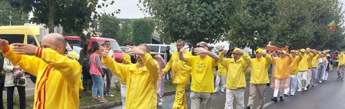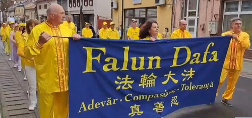 Практикующие Фалунь Дафа демонстрируют упражнения на параде, организованном правительством городом Бая-Маре