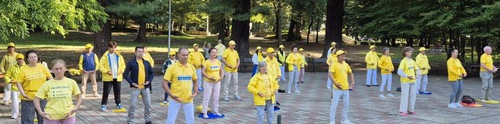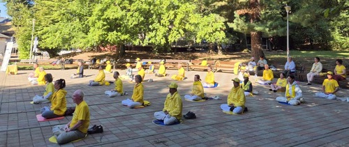Практикующие демонстрируют упражнения Фалунь Дафа на пункте практики в парке Регина Мария