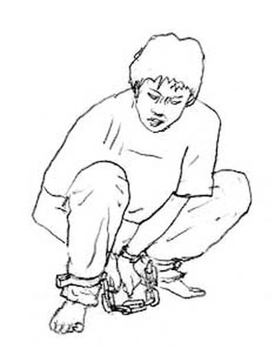 Иллюстрация пытки: вдеть нитка в иголку и заковать в кандалы