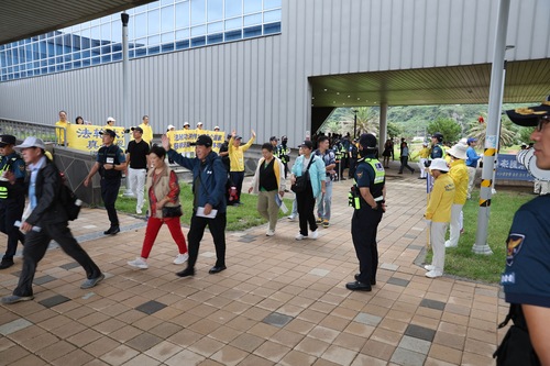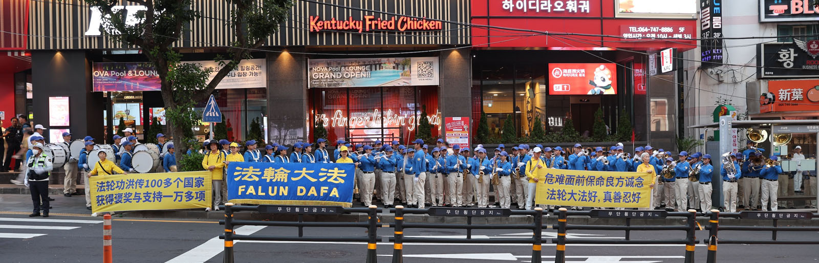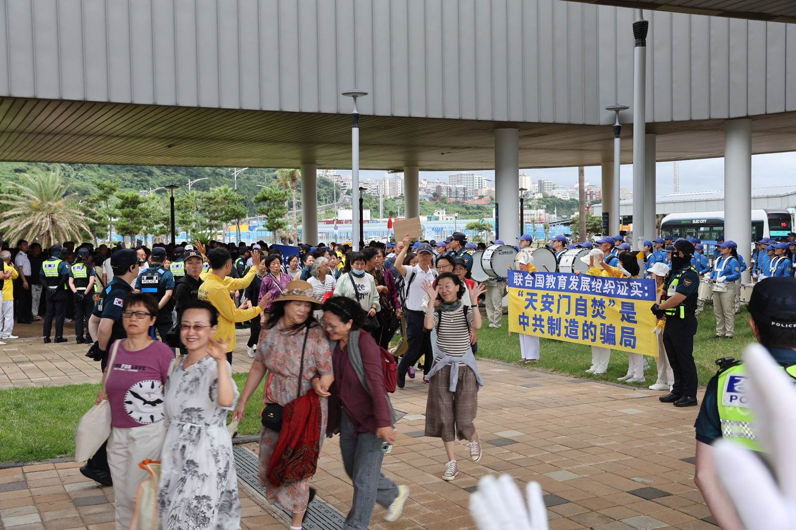 Поскольку территория порта небольшая, некоторые практикующие стояли с плакатами у выхода, чтобы туристы в автобусах могли их прочитать. После этого практикующие отправились к магазинам беспошлинной торговли Lotte Duty-Free Shop, где выступление духового оркестра Тянь Го привлекло внимания множества туристов.