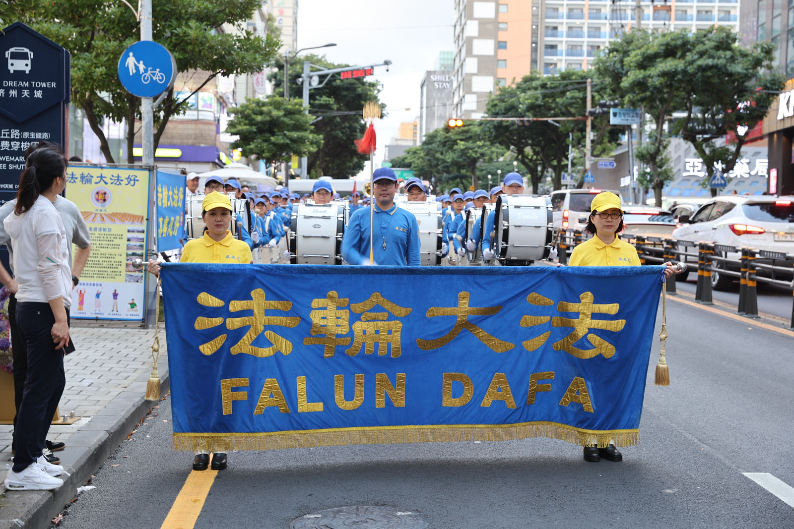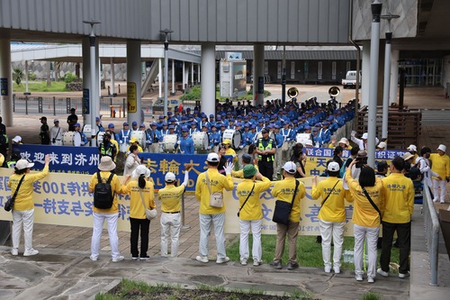 Практикующие собрались в порту Чеджу и улыбаясь встречали туристов с плакатом «Добро пожаловать в Чеджудо!» Когда первая группа туристов сошла с круизного лайнера, духовой оркестр Тянь Го исполнил музыкальную композицию «Фалунь Дафа несёт добро». Многие люди приветливо улыбались практикующим, а некоторые фотографировали или снимали на видео выступление и плакаты.
