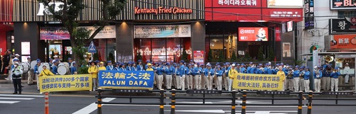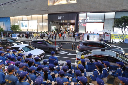 Возле магазинов беспошлинной торговли Shilla Duty-Free Shop китайские туристы слышали выступление духового оркестра Тянь Го и видели надписи на плакатах. Общаясь с практикующими, они узнавали правду о Фалунь Дафа и некоторые из них решили выйти из рядов компартии Китая и принадлежащих ей организаций.