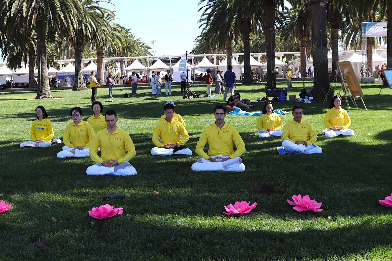 Практикующие Фалунь Дафа демонстрируют пять комплексов упражнений на сцене и на лужайке в парке во время 24-го фестиваля «Глобальная деревня» в Ирвайне, 11 октября 2025 года
