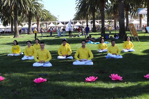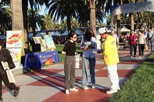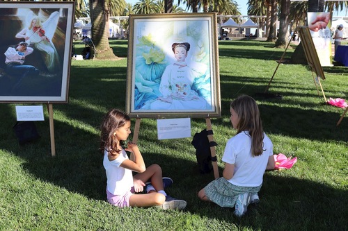 Практикующие выставили на лужайке репродукции картин с Международной выставки «Искусство Чжэнь Шань Жэнь». Люди останавливались, чтобы полюбоваться ими и задать вопросы. Пока две женщины задавали вопросы, сопровождавшие их девочки подошли посмотреть на картины, а затем сели и стали повторять позы медитации, изображенные на них. К ним подошла молодая практикующая, чтобы научить их движениям этого упражнения. На прощанье девочкам подарили маленькие бумажные цветы лотоса.