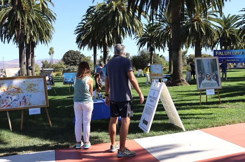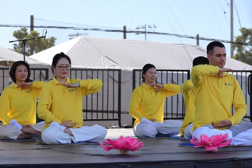 Они продемонстрировали пять комплексов упражнений Фалунь Дафа и представили картины с международной художественной выставки «Искусство Чжэнь Шань Жэнь (Истина, Доброта, Терпение)», чтобы посетители могли больше узнать об этой практике совершенствования.