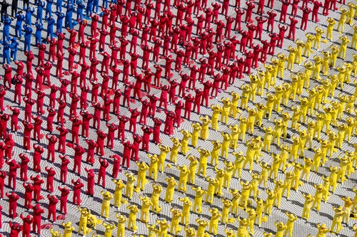 Вид с высоты птичьего полёта на эмблему Фалунь и иероглифы «Фалунь вращается всегда», сформированные практикующими