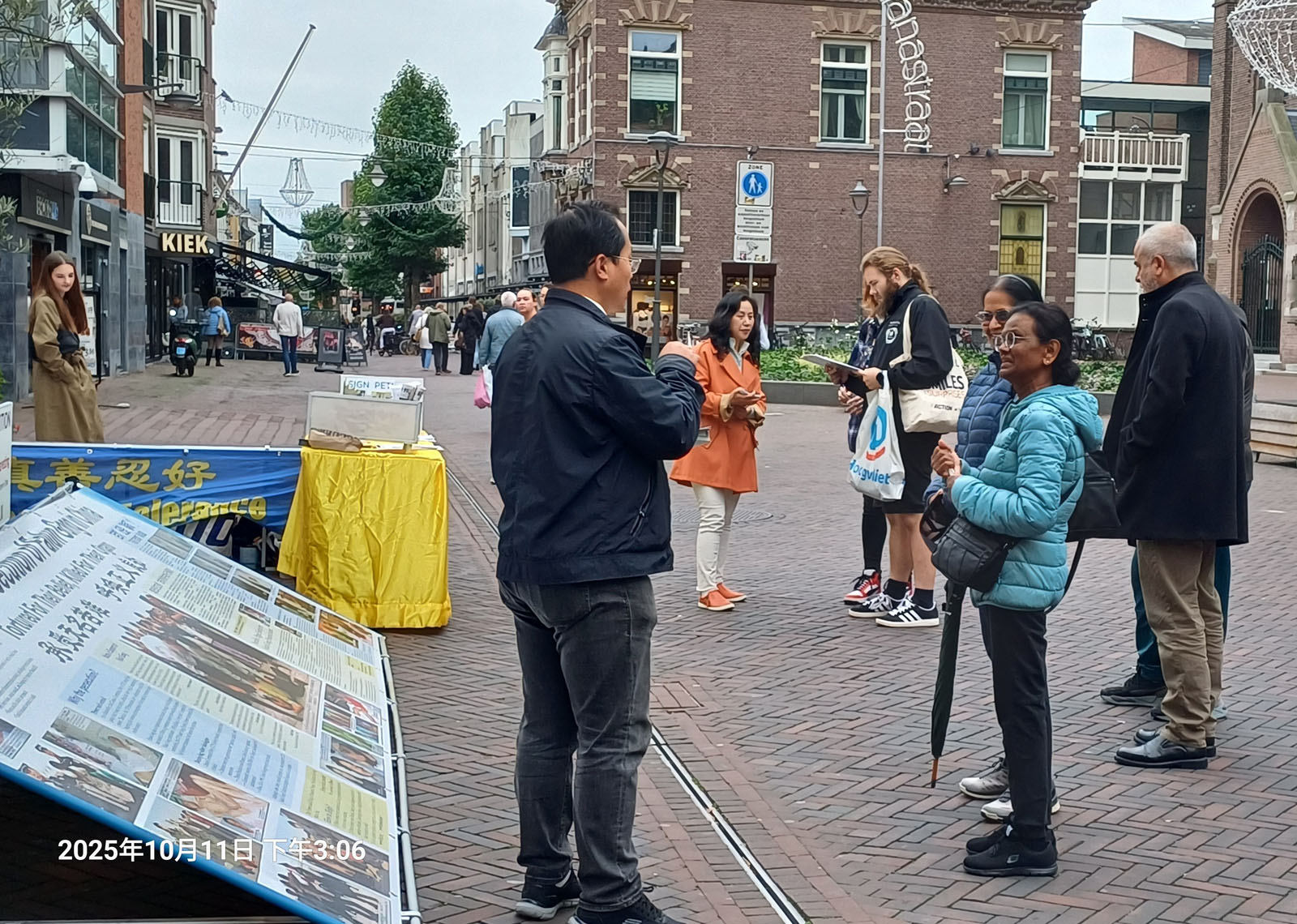 (Minghui.org) 11 октября 2025 года в Алфен-ан-ден-Рейне на юге Нидерландов практикующие Фалунь Дафа (Фалуньгун) провели информационное мероприятие, целью которого было познакомить людей с этой практикой совершенствования сознания и тела и привлечь внимание к преследованию последователей Фалунь Дафа, санкционированному компартией Китая (КПК).