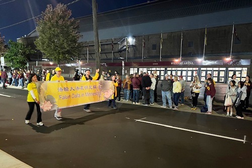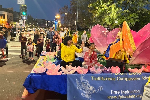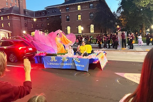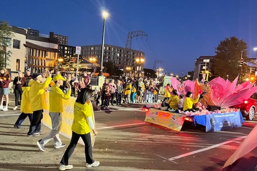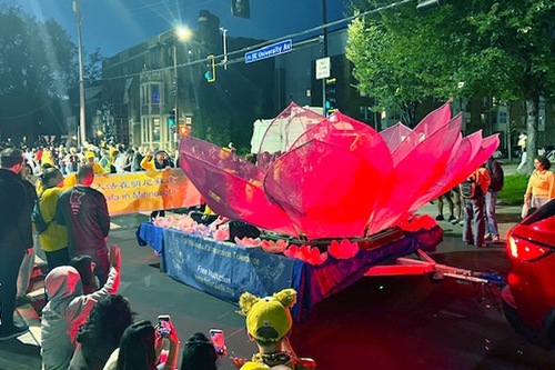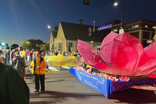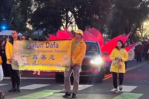 Парад начался в 18:30. Платформа членов клуба Фалуньгун Twin Cities была украшена большим розовым цветком лотоса, а практикующие, одетые в традиционные китайские костюмы, с энтузиазмом приветствовали зрителей. Практикующие несли плакаты впереди и позади платформы, а также раздавали цветы лотоса вдоль маршрута парада.