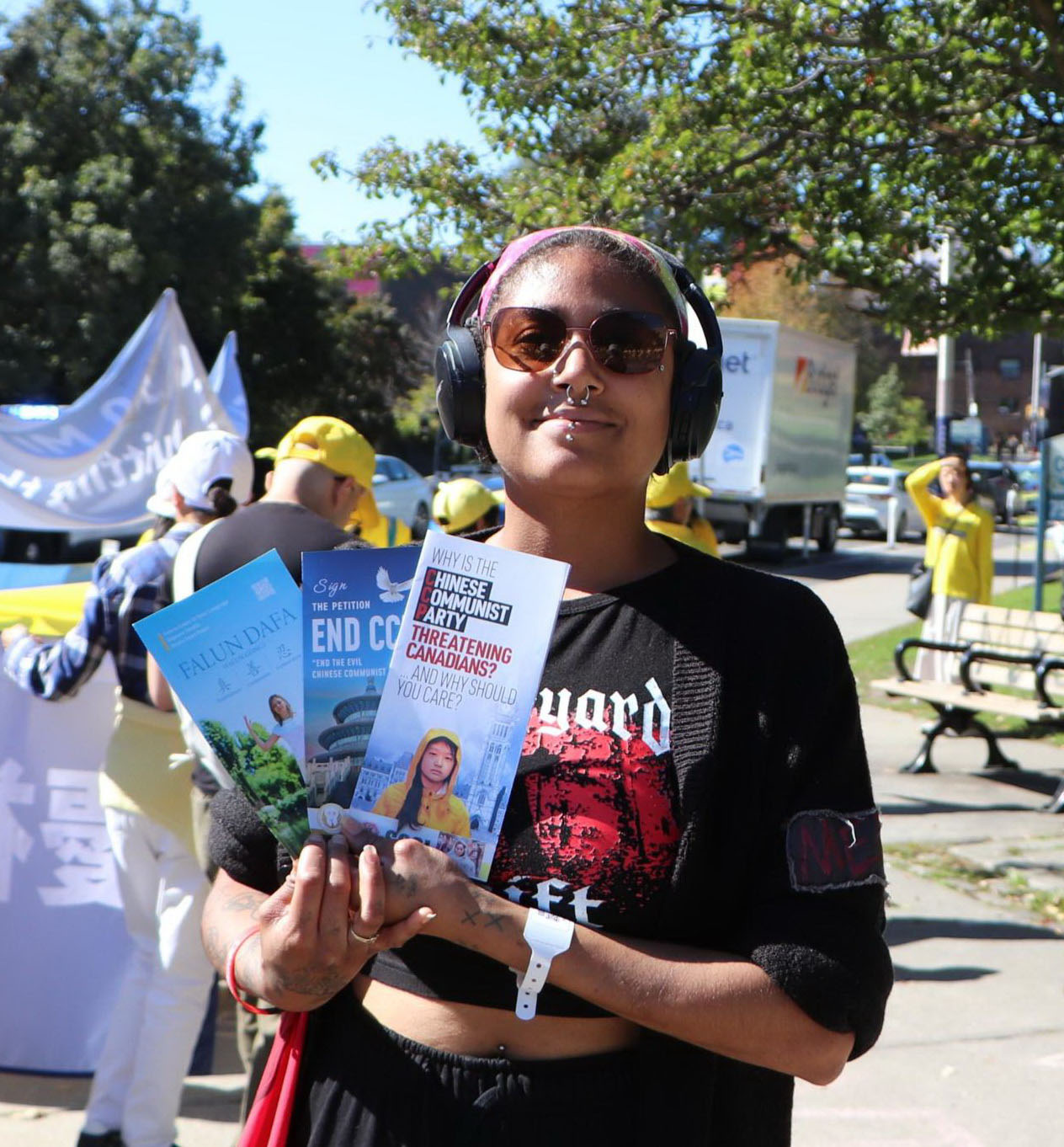 Фатима случайно оказалась в этом районе как раз перед началом марша. Она поговорила с практикующим и узнала о преследовании. Фатима заявила, что она категорически против санкционированного государством насильственного извлечения органов у практикующих и транснациональных репрессий, осуществляемых КПК. «Канада – свободная страна, и в ней не должно происходить ничего, что могло бы угрожать канадским гражданам». Она считает, что КПК угрожает проведению гастролей Shen Yun Performing Arts, потому что художественный коллектив этой компании разоблачает преследование Фалуньгун компартией Китая. Она пообещала подписать петицию, призывающую канадское правительство принять меры к прекращению транснациональных репрессий последователей Фалуньгун, осуществляемых КПК.