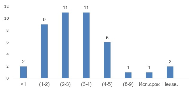 На диаграмме: по вертикали – число осуждённых практикующих; по горизонтали – сроки заключения (в годах)