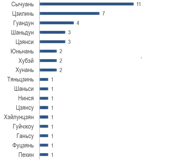 Судебные приговоры последователям Фалуньгун были вынесены в 17 провинциях или муниципалитетах центрального подчинения. Большинство случаев зарегистрировано в провинции Сычуань (11), за ней следуют провинции Цзилинь (7) и Гуандун (4). В Цзянси и Шаньдуне было зафиксировано по 3 случая. В остальных 12 регионах было зарегистрировано от 1 до 2 случаев.