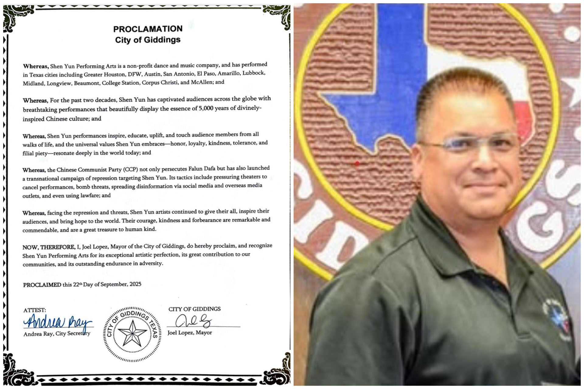 Мэр города Гиддингс Джоэл Лопес 22 сентября 2025 года выпустил прокламацию в поддержку Shen Yun Performing Arts, отметив, что труппа через свои изысканные постановки раскрывает суть божественно вдохновлённой культуры и приносит пользу обществу и стране. Он также высоко оценил мужество и доброту артистов Shen Yun, которые продолжают выступать несмотря на транснациональные репрессии, осуществляемые компартией Китая (КПК).