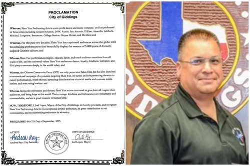 Мэр города Гиддингс Джоэл Лопес 22 сентября 2025 года выпустил прокламацию, выражая благодарность Shen Yun