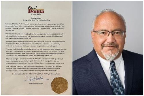Дэвид Морено, мэр города Донна, 15 сентября 2025 года издал прокламацию о признании Shen Yun Performing Arts