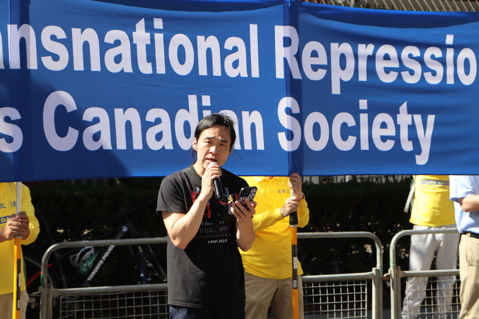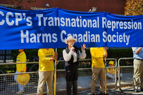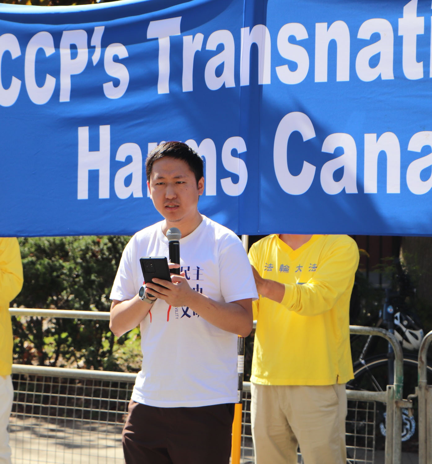Выступая на митинге, представитель практикующих Ли Цян осудил транснациональные репрессии КПК, направленные против последователей Фалуньгун в Канаде и во всём мире. Он сказал, что это включает в себя использование членов китайских общин для нападок и оскорблений практикующих Фалуньгун, проникновение в зарубежные СМИ с целью дискредитации Фалуньгун и компании Shen Yun Performing Arts, засылку шпионов для слежки за практикующими и членами их семей и угроз в их адрес, а также срыв представлений Shen Yun путём угроз театрам и повреждения автобусов компании Shen Yun Performing Arts.