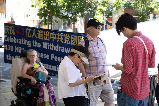 Турист спросил практикующего: «Вы призываете людей заниматься Фалунь Дафа?» Практикующий объяснил, что цель мероприятия – разъяснить правду о преследовании, опровергнуть клевету компартии Китая и призвать к прекращению преследования. Он сказал, что КПК распространяет ложь о Фалунь Дафа, в том числе, фальсификацию о самосожжении на площади Тяньаньмэнь, и распространила преследование уже и за пределы страны, например, вмешиваясь в деятельность компании Shen Yun Performing Arts в США и других странах.