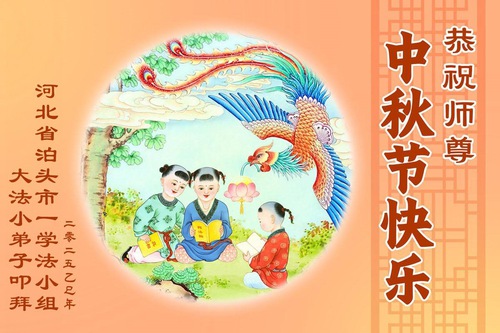 Юный практикующий Фалунь Дафа из города Чаоян в провинции Ляонин написал: «Учитель, поздравляю Вас с праздником Середины осени! Спасибо за моё милосердное спасение. Мне очень повезло, что с ранних лет я был погружён в Фа. Учитель, вы много работаете! Вы рядом со мной каждый день!»