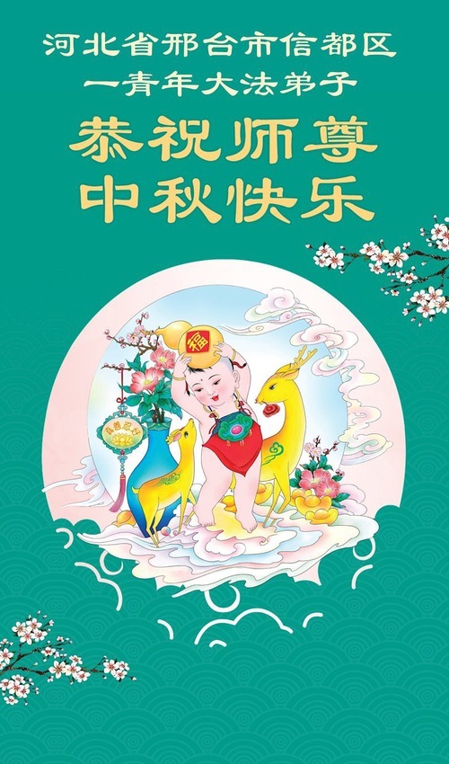 «Я начал практиковать Фалунь Дафа совсем недавно, но уже ощутил благотворное влияние практики на здоровье и силу принципов “Истина, Доброта, Терпение”. Я обязательно буду строго требовать от себя, чтобы стать хорошим человеком и даже ещё лучше. Спасибо, Учитель Ли, и желаю вам счастливого праздника Середины осени!» – написал молодой практикующий из города Тяньмэнь в провинции Хубэй.