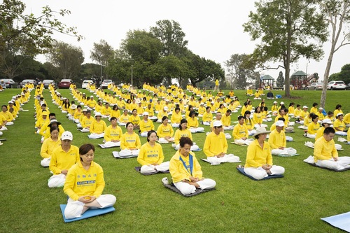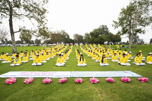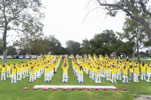 Последователи Фалуньгун из Большого Лос-Анджелеса собрались в региональном парке Майл-сквер в Фаунтин-Вэлли в округе Ориндж в воскресенье, 21 сентября 2025 года, чтобы передать поздравления Учителю Ли Хунчжи, основателю Фалуньгун