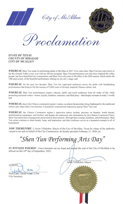 «ПРИНИМАЯ ВО ВНИМАНИЕ, что Shen Yun дебютировал в Мак-Аллене в 2017 году и с тех пор каждый год приезжает в долину Рио-Гранде с совершенно новой программой; что выступления Shen Yun не только вдохновляют жителей долины, но и украшают наше сообщество; что Shen Yun приедет в Мак-Аллен в сезоне 2026 года, и это будет 10-я годовщина прекрасного выступления, сияющего на сцене нашего города; и