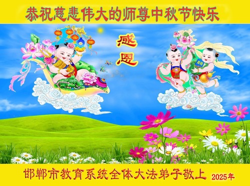 «Я учусь в четвёртом классе и практикую Фалунь Дафа уже почти год. С тех пор, как я начал практиковать, мне больше не нужно ходить к врачу, так как у меня прошло серьёзное заболевание, у меня также повысилась успеваемость в школе. Родители больше не беспокоятся обо мне; я всегда нахожусь под защитой Учителя. В дни праздника Середины осени вся моя семья желает Учителю счастливого праздника Середины осени!»