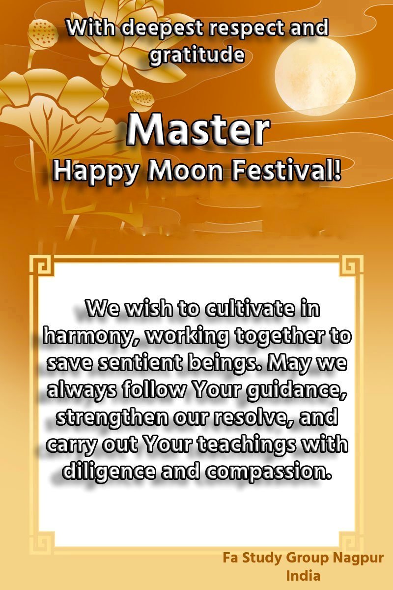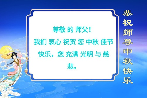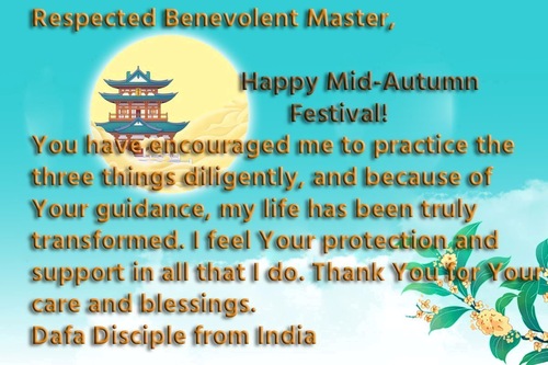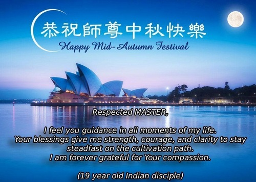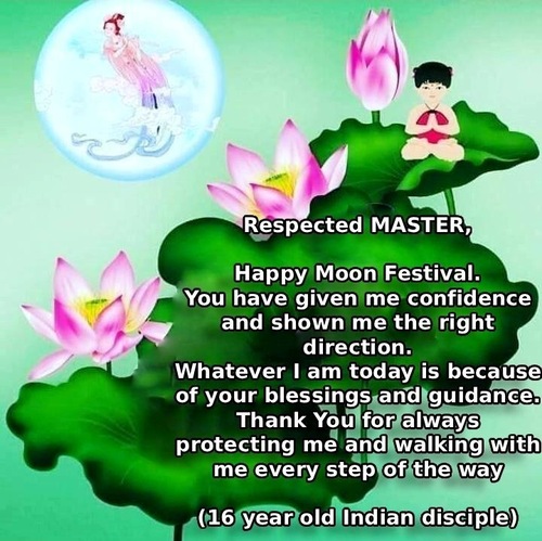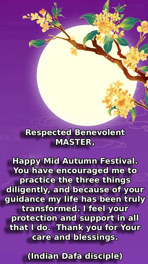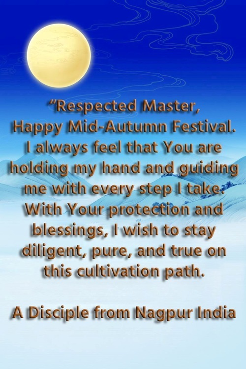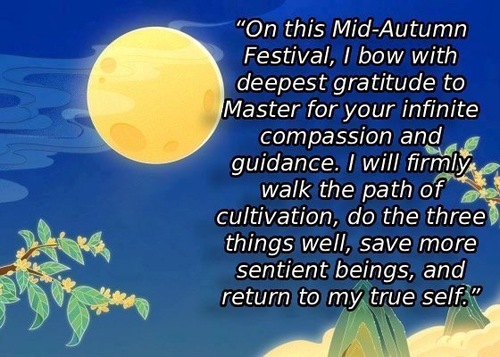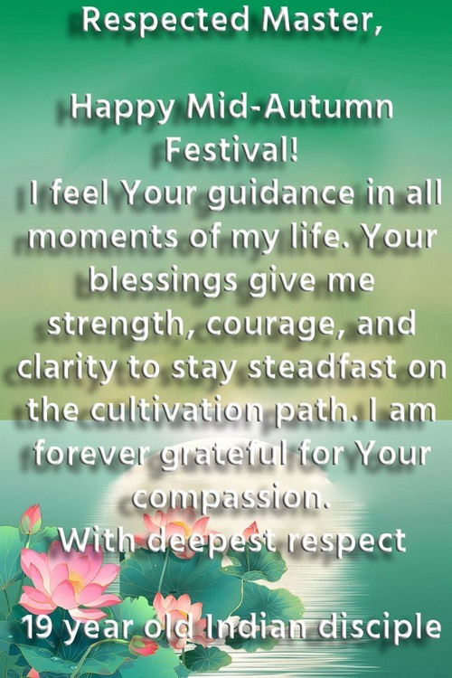 Поздравляю Вас с праздником Середины осени! Вы наставляете меня усердно выполнять три дела, и благодаря Вашему руководству моя жизнь по-настоящему изменилась. Я всегда чувствую Вашу защиту и помощь. Спасибо Учитель за заботу и благословение!