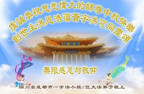 Шесть практикующих из города Чэнду в провинции Сычуань, каждому из которых около 80 лет, часто вместе читают Книги Фалунь Дафа. Они поздравляют Учителя Ли с праздником Середины осени!