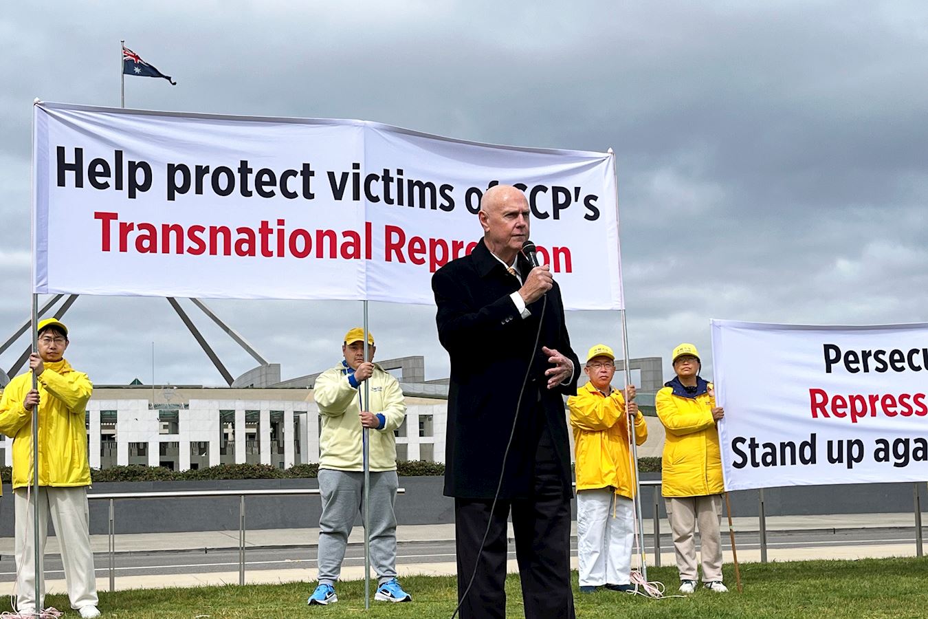 Джон Деллер, спикер Ассоциации Фалунь Дафа Австралии, в своей речи на митинге заявил: «Транснациональные репрессии – это форма репрессий, которая не знает границ. Она исходит из Китая через систему компартии Китая, и это обширные масштабы.