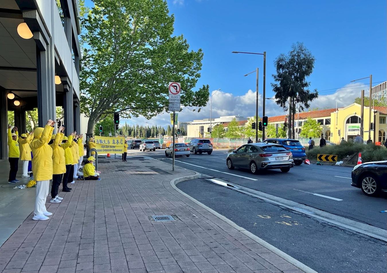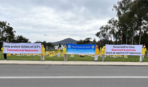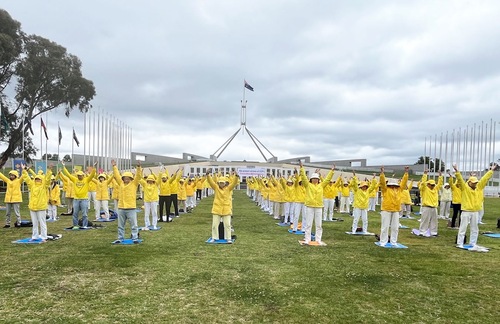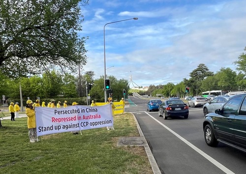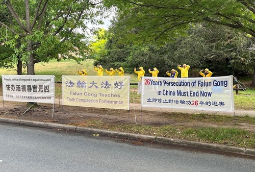 В течение нескольких дней подряд в утренние часы пик практикующие устанавливали плакаты, демонстрировали пять комплексов упражнений в центре Канберры, а также собирали подписи, чтобы помочь остановить извлечение органов