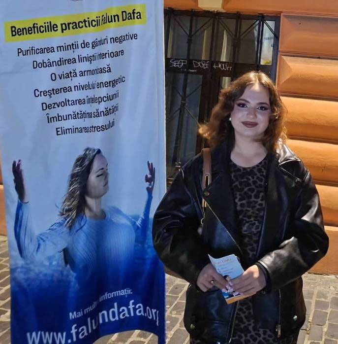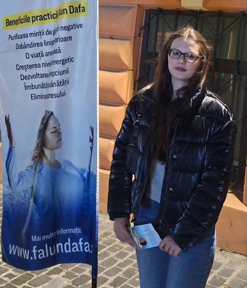 Ирина Ватагу, студентка факультета литературы в Брашове, сказала, что её внимание привлекли плакат и музыка, поэтому она подошла к стенду. «Услышав музыку, я задалась вопросом, что происходит, потому что обычно в центре города такого не увидишь. Затем я прочитала надпись на плакате и решила, что это хорошее дело, поэтому подписала петицию», – сказала она. Ватагу считает, что принципы Фалунь Дафа могут создать гармоничное общество и принесут пользу людям.