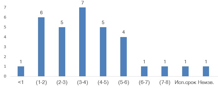 На диаграмме: по вертикали – число осуждённых практикующих; по горизонтали – сроки заключения (в годах)