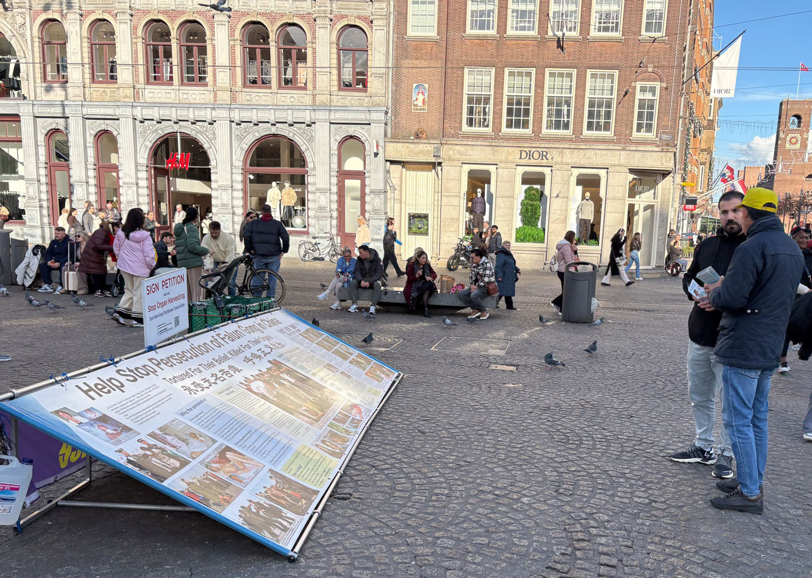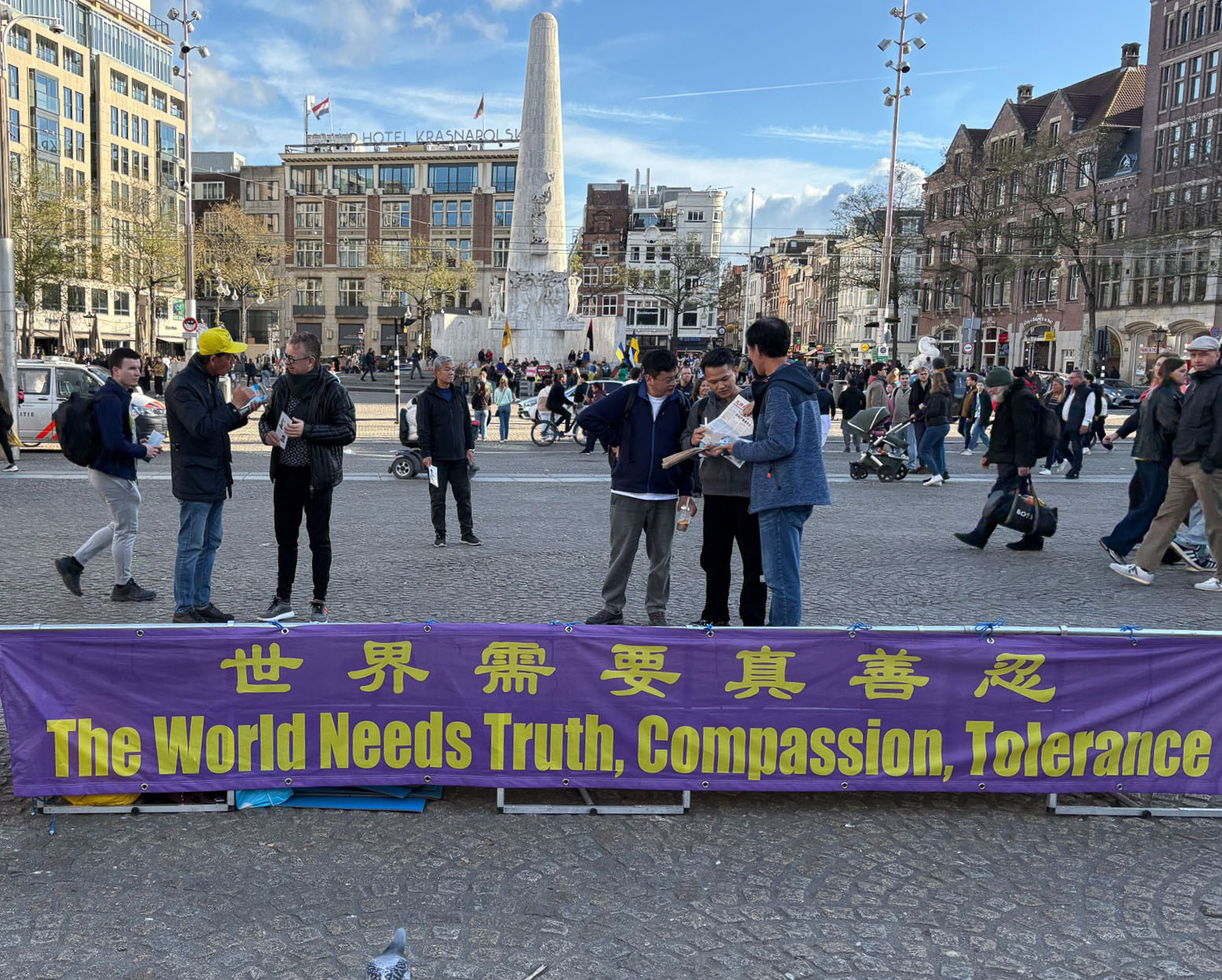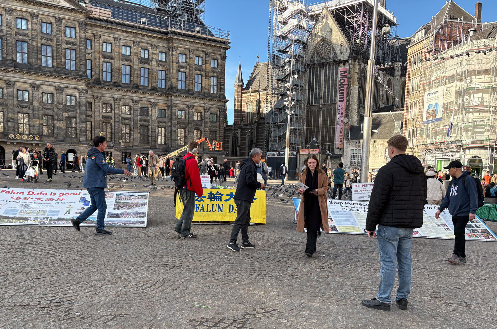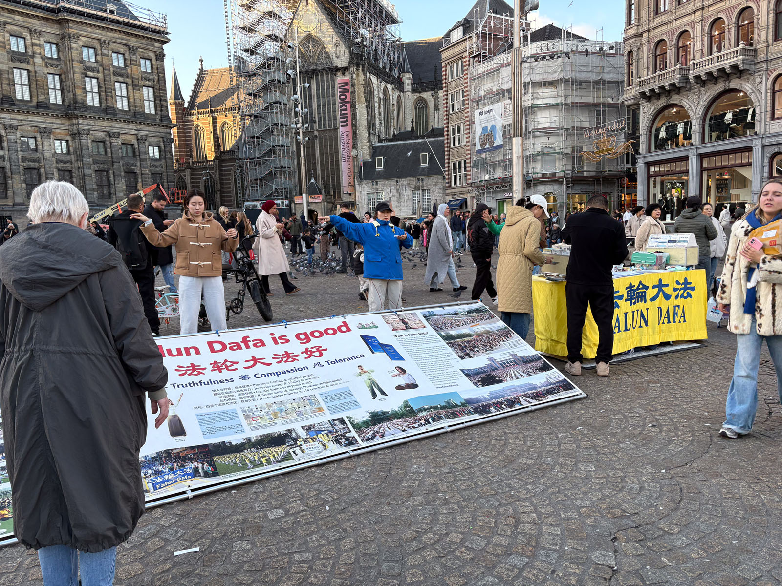(Minghui.org) 9 ноября 2025 года практикующие Фалунь Дафа провели мероприятие на площади Дам в Амстердаме. Эта площадь исторически была местом, где проводились многочисленные общественные мероприятия. Здесь же прошло и мероприятие практикующих Фалунь Дафа, направленное на то, чтобы информировать людей о продолжающемся в Китае преследовании.