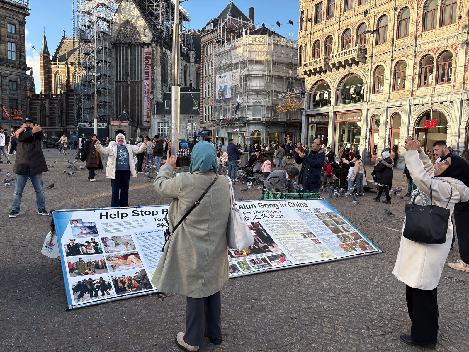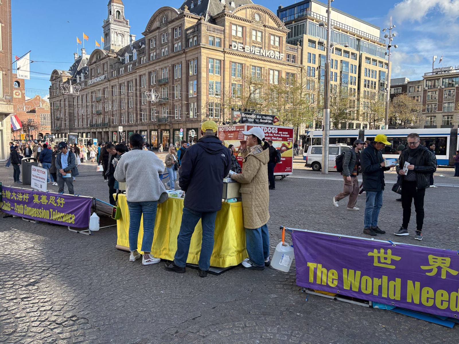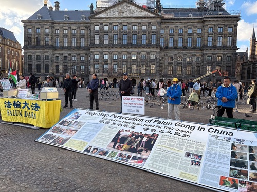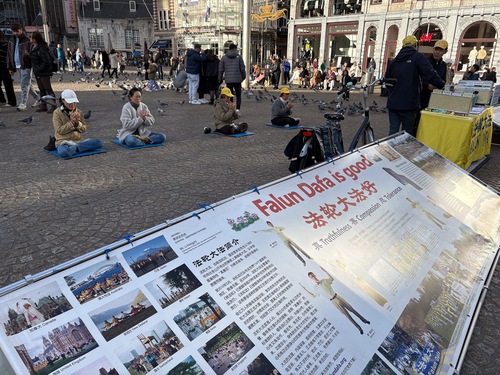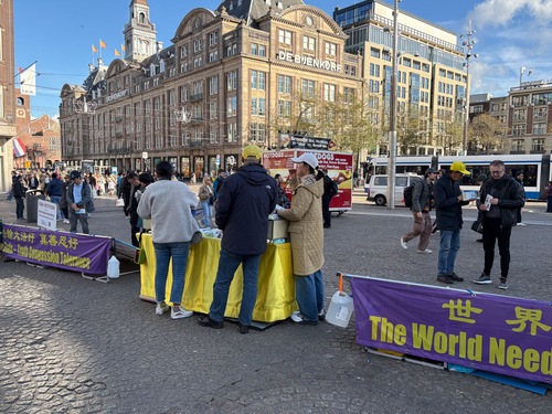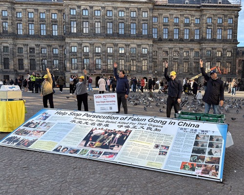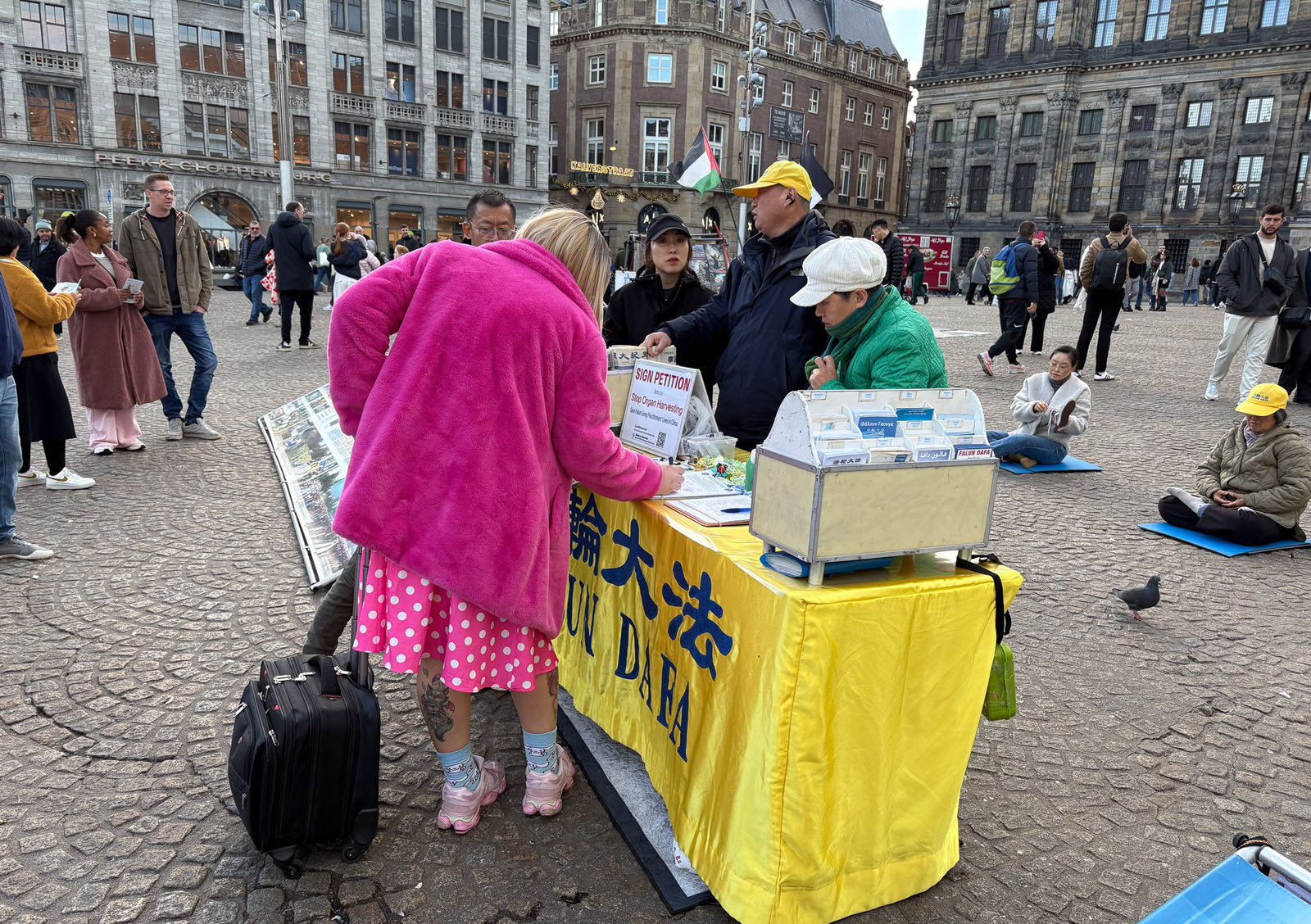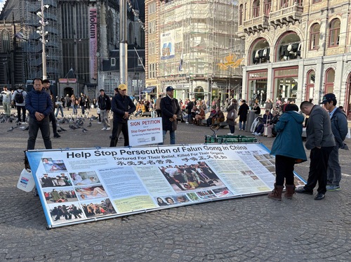 (Minghui.org) 9 ноября 2025 года практикующие Фалунь Дафа провели мероприятие на площади Дам в Амстердаме. Эта площадь исторически была местом, где проводились многочисленные общественные мероприятия. Здесь же прошло и мероприятие практикующих Фалунь Дафа, направленное на то, чтобы информировать людей о продолжающемся в Китае преследовании.