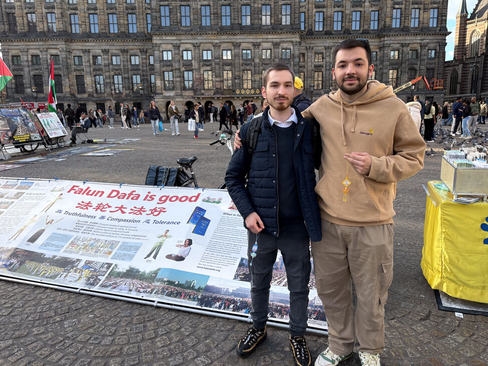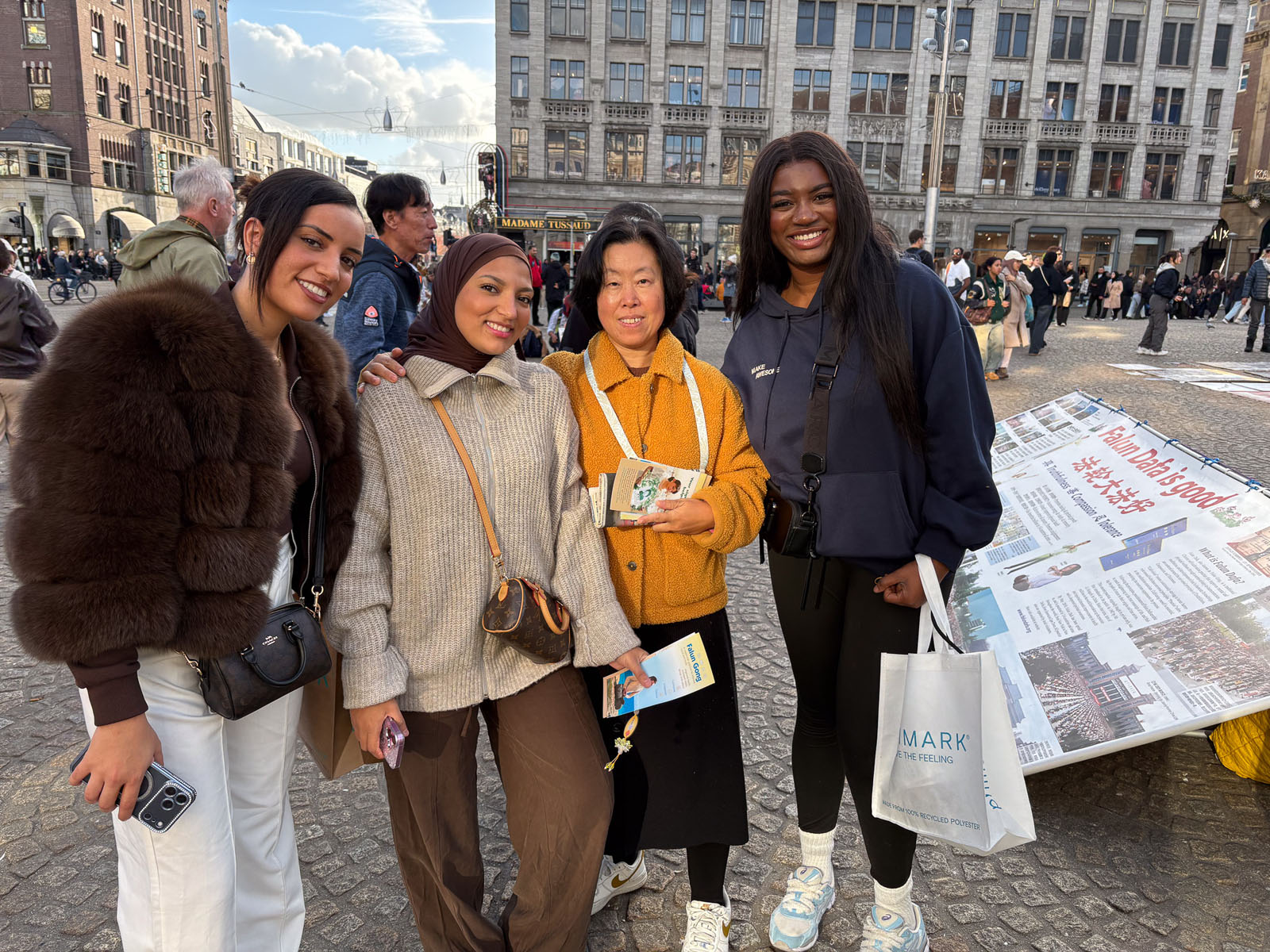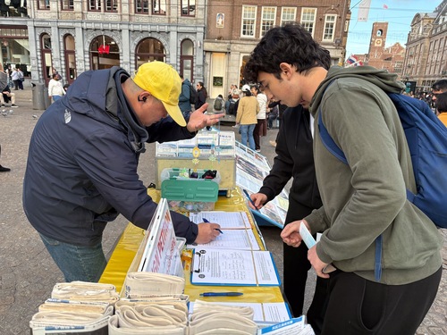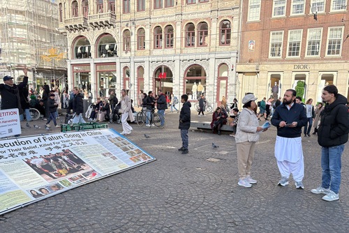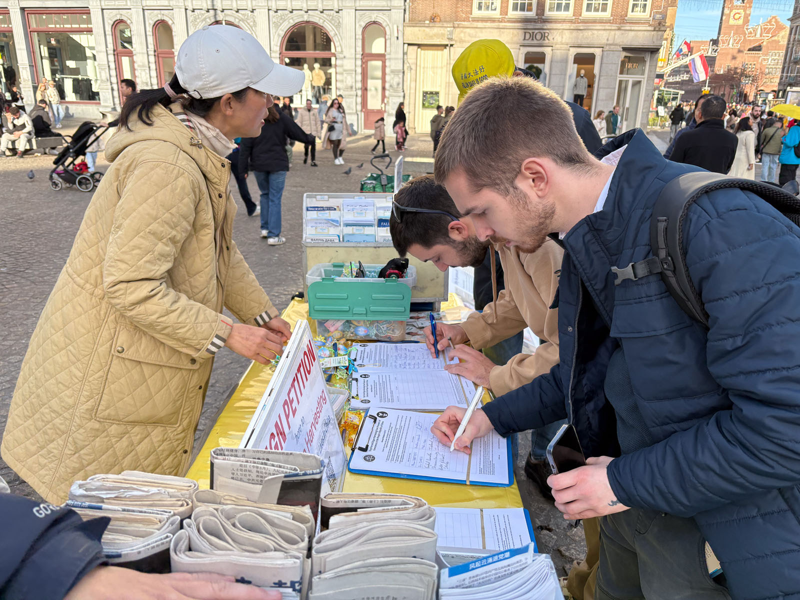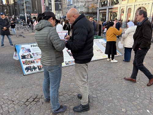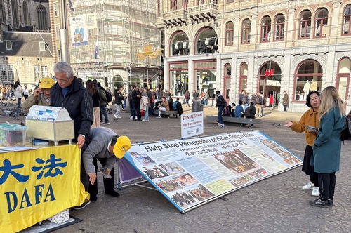 (Minghui.org) 9 ноября 2025 года практикующие Фалунь Дафа провели мероприятие на площади Дам в Амстердаме. Эта площадь исторически была местом, где проводились многочисленные общественные мероприятия. Здесь же прошло и мероприятие практикующих Фалунь Дафа, направленное на то, чтобы информировать людей о продолжающемся в Китае преследовании.
