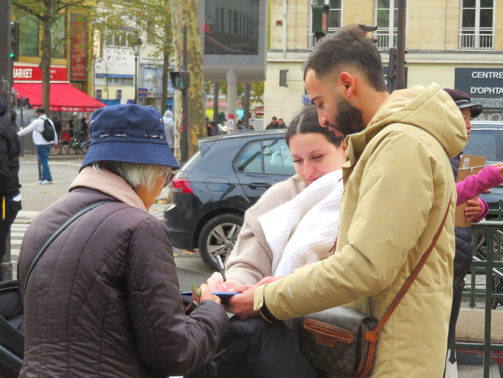 (Minghui.org) 8 и 11 ноября 2025 года практикующие Фалунь Дафа провели мероприятия на площади Италии и квартале Бельвиль в Париже, а также в городе Кольмаре на востоке Франции, чтобы познакомить людей с Фалунь Дафа (или Фалуньгун) и рассказать о преследовании практики Коммунистической партией Китая (КПК). Многие люди беседовали с практикующими и узнали о нарушениях прав человека в Китае.