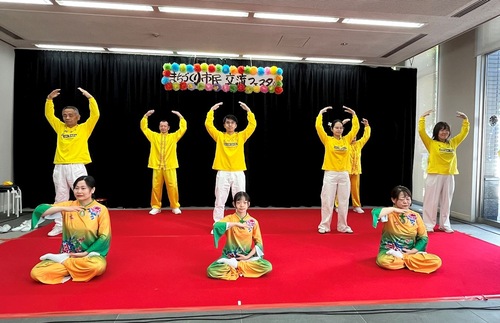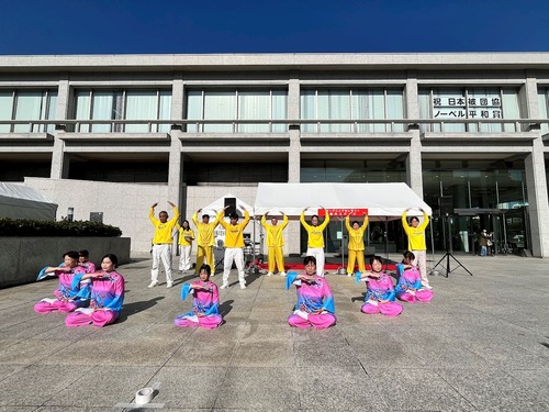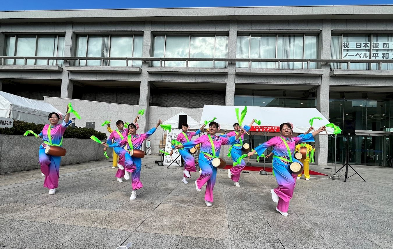 Практикующие Фалуньгун из Хиросимы исполнили танец с поясными барабанами на сцене во время Фестиваля общественного мнения по вопросам городского планирования, 15 ноября 2025 года