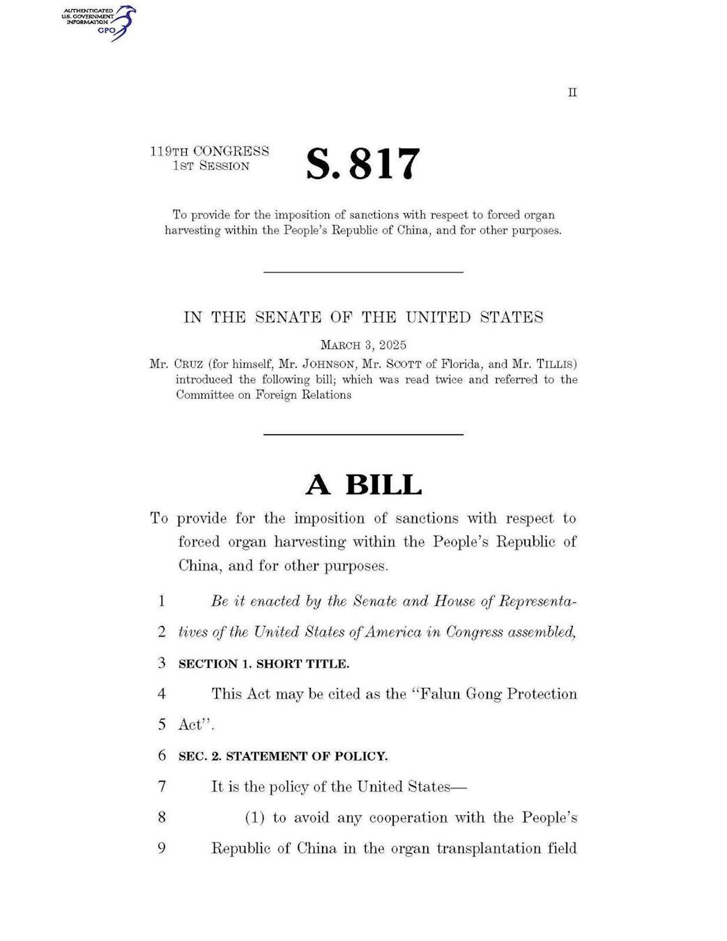 Закон «О защите Фалуньгун» (S.817) был представлен сенатором Тедом Крузом 3 марта 2025 года. В законопроекте говорится, что с санкции компартии Китая (КПК) по-прежнему проводится насильственное извлечение органов у практикующих Фалуньгун. Законопроект предусматривает меры ограничения в отношении лиц, причастных к насильственному извлечению органов в Китайской Народной Республике.