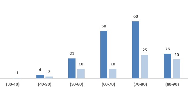 На диаграмме: по вертикали – число практикующих Дафа; по горизонтали – возраст практикующих (в годах). Синий цвет – число арестованных практикующих, голубой цвет – число практикующих, подвергшихся другим видам преследования