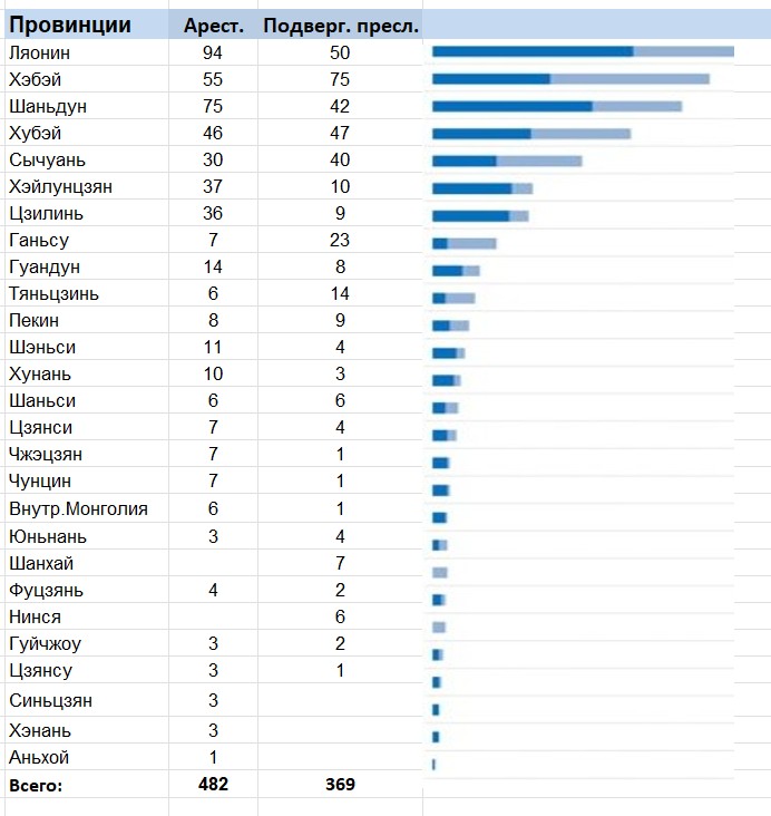 На диаграмме: по вертикали – названия провинций; по горизонтали – число случаев арестов и других видов преследования; тёмно-синий цвет – число арестованных; светло-синий – число подвергнутых другим видам преследования