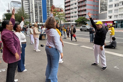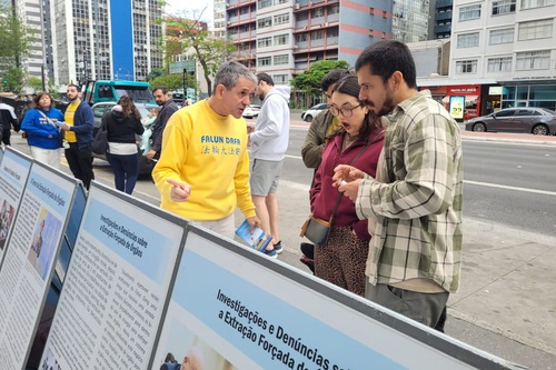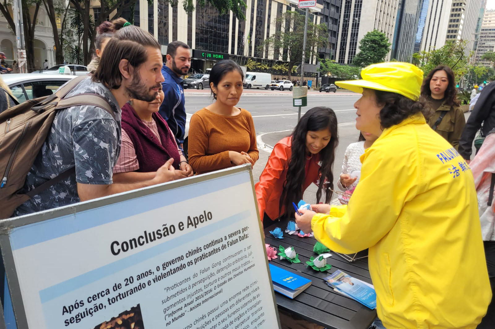(Minghui.org) Практикующие Фалунь Дафа из разных частей Бразилии, включая Рио-де-Жанейро, Бразилиа и Минас-Жерайс, 9 ноября 2025 года собрались на проспекте Паулиста в центре Сан-Паулу, чтобы провести мероприятие и рассказать людям о пользе своей духовной практики. Жители города и туристы также имели возможность узнать о продолжающемся преследовании практикующих Фалунь Дафа (или Фалуньгун) компартией Китая (КПК).