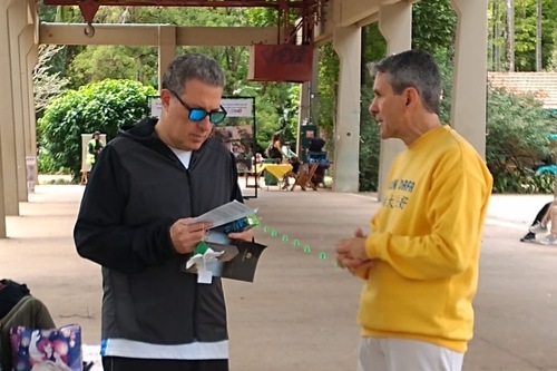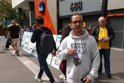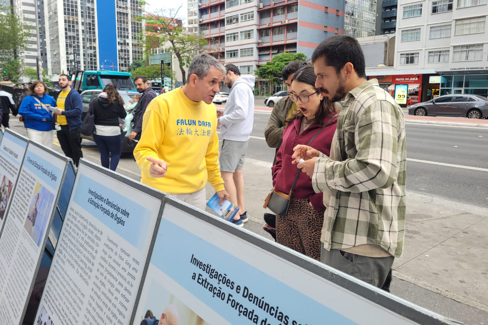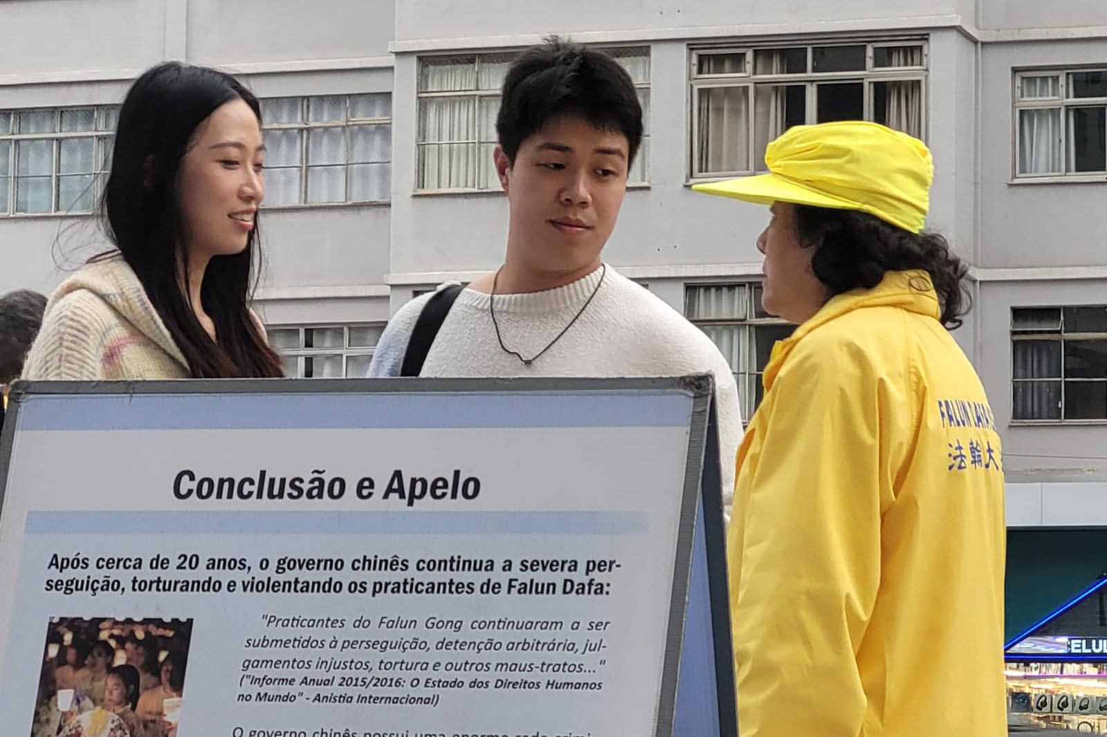 В тот вечер практикующие разговаривали с прохожими, и многие люди останавливались, чтобы прочитать информацию на стендах. Альберто, практикующий из Сан-Паулу, рассказывал прохожим о бесчеловечном преследовании, которому подвергаются практикующие Фалунь Дафа в Китае из-за своей веры.