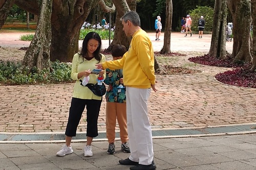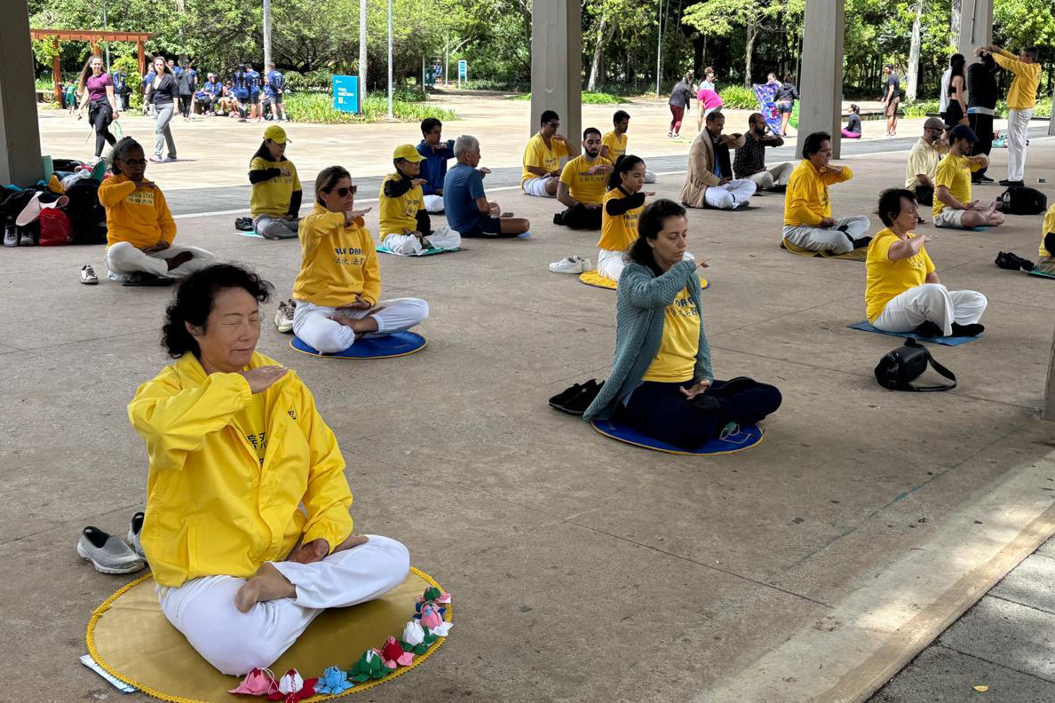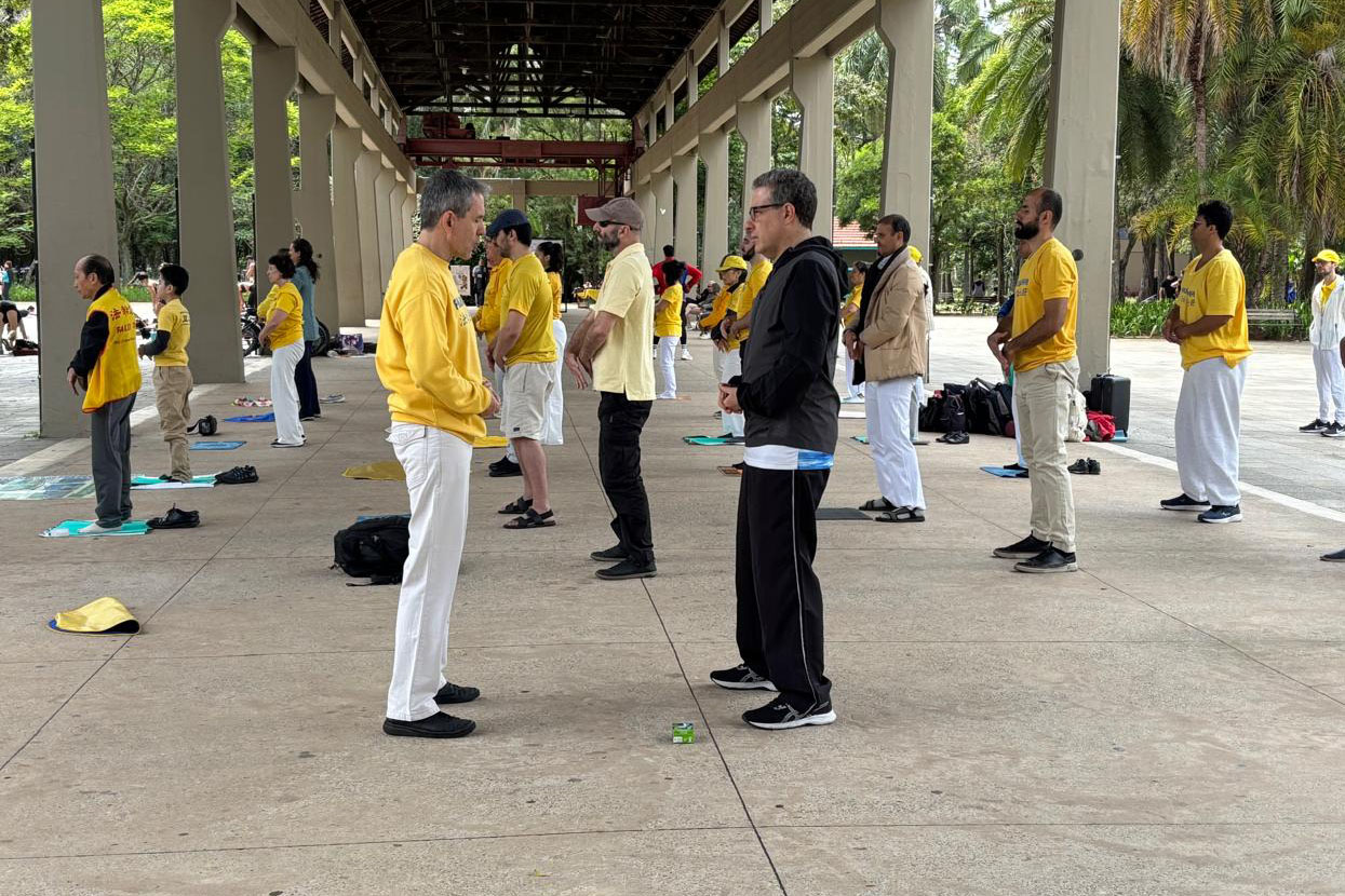 В то утро практикующие выполняли упражнения и изучали лекции Фалунь Дафа в популярном парке Ибирапуэра в Сан-Паулу.