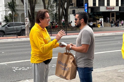 Он также сказал, что его тронули позитивные ценности «Истина, Доброта, Терпение», которые проповедует Фалунь Дафа, и что он придёт на площадку для занятий в парке, чтобы научиться выполнять упражнения.
