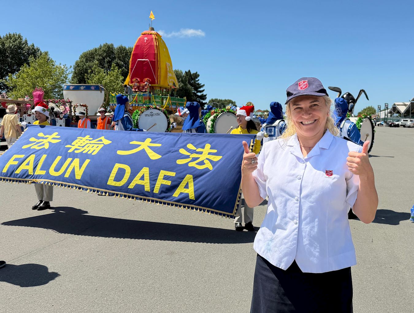 Участница оркестра Армии спасения выражает поддержку Фалунь Дафа