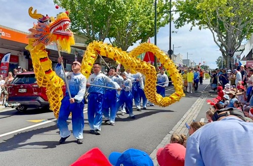 Исполнители танца дракона приняли участие в Рождественском параде в Онехунге (пригород Окленда) 22 ноября 2025 года