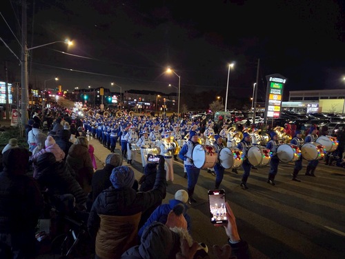 Марширующий оркестр Тянь Го принимает участие в параде Санта Клауса в Эйджаксе в шесть часов вечера 22 ноября 2025 года