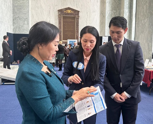 На мероприятии, посвящённом Дню прав человека, практикующая Фалунь Дафа Лидия Ван (первая справа) рассказала члену Палаты представителей США Янг Ким (первая слева) о страданиях, пережитых её родителями во время преследования компартией Китая, 10 декабря 2025 года