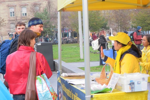 Одна студентка попросила практикующих предоставить больше информации о преследовании и взяла листовки, чтобы поделиться ими с однокурсниками в колледже. Она поблагодарила практикующих за предоставление этой ценной информацией.
